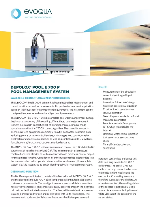 - The DEPOLOX Pool E 700 P system is a complete pool water management system that incorporates many of the existing differentiated pool water treatment features such as DIN contact, shock chlorination menu, economic mode operation as well as the CEDOX control algorithm. The controller supports all chemical feed applications commonly found in pool water treatment such as dosing pumps or relay control feeders, chlorine gas feed control, on-site electrochlorination system operation as well as a control signal to UV systems, flocculation and/or activated carbon slurry feed systems.
