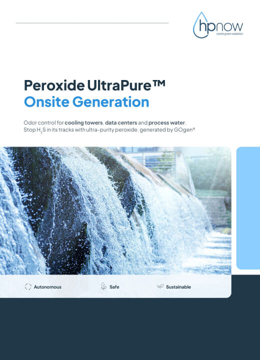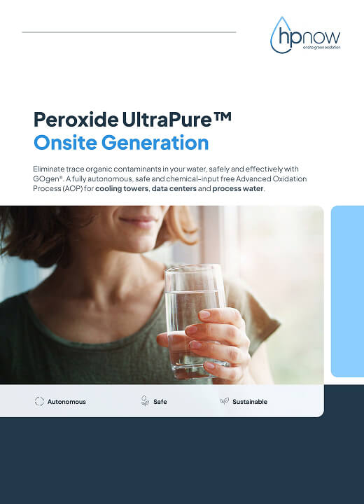 GOgenTM — Green Oxidant generator — by HPNow autonomously generates safe, sustainable, ultrahigh purity H₂O₂ directly on site. GOgenTM inputs are only water and electricity. Output Peroxide UltraPureTM solution is generated at a safe concentration of up to 1% and temporarily stored in a buffer tank, from which it is dosed into the treated water. The buffer tank is automatically refilled based on actual demand. HPNow further provides a remote GOgen system monitoring service to ensure a smooth and fully controllable operation without the need for on-site presence.
