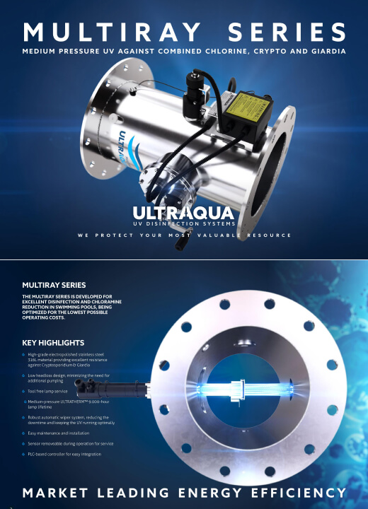 The MULTIRAY™ series is based on numerous years of scientific research and R&D activities, optimized for disinfection, chloramine reduction, and crypto/giardia safety in swimming pools. The result is a much lower combined chlorine level, better air quality, and simply healthier water.