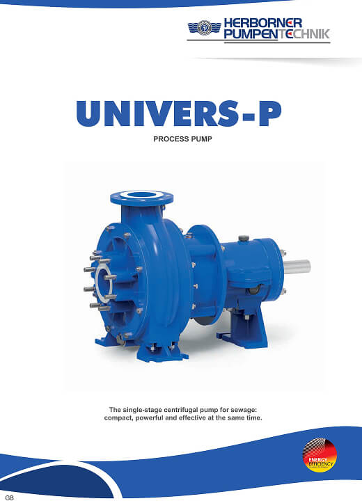 The process pumps of the UNIVERS-P series were constructed especially for hard use in pumping stations and sewage treat-ment plants with direct operation via coupling or V-belt drive. Reliability and long operating periods together with the highest possible efficiency are priorities during development – these fac-tors all combine to achieve very low life cycle costs. The higher flywheel mass inertia made possible in the design minimises the impact of water hammer in the pipeline system.