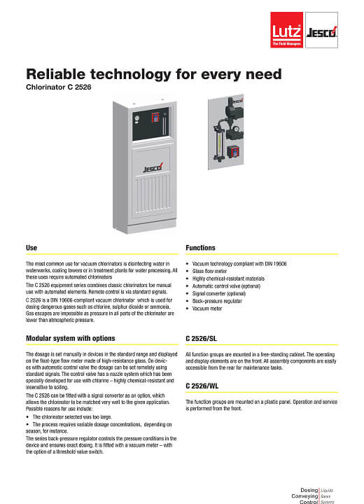 The most common application for vacuum chlorinators is the disinfection of water in water pipes, cooling towers, or process water treatment plants. Automatic dosing units are required for all these applications. The C 2526 and C 2701 chlorinators have a clear modular structure. From compact devices with all functions in a single housing to functional assemblies for individual system design, you always have access to a reliable vacuum system.